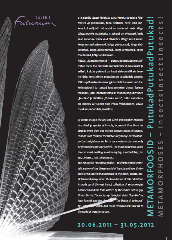 Putukanäitus esitab loo putukate mitmekesisest maailmast ja sellest, kuidas putukad on inspiratsiooniallikaks inseneridele, kunstnikele ja muusikutele. Näituse vundamendiks on entomoloogi Allan Selini arvukas putukakollektsioon ja tuntud loodusemehe Urmas Tartese tekstid ning slaidiprogramm. Jaan Toomiku sotsiaal-psühholoogiline video «Jaanika» ning PÖFF-il tähelepanu äratanud Hannes Vartiaineni ja Pekka Veikkolaineni lühifilm «Putuka surm» viivad muuseumikülastajad muundumiste maailma.